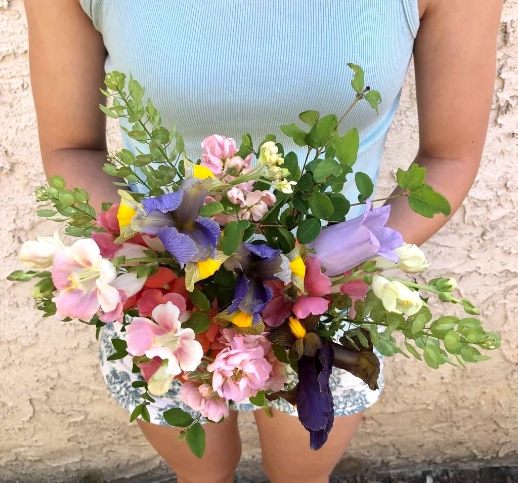 Person holding a colorful bouquet of pink, purple, yellow, and cream flowers with green leaves, standing against a beige brick wall.